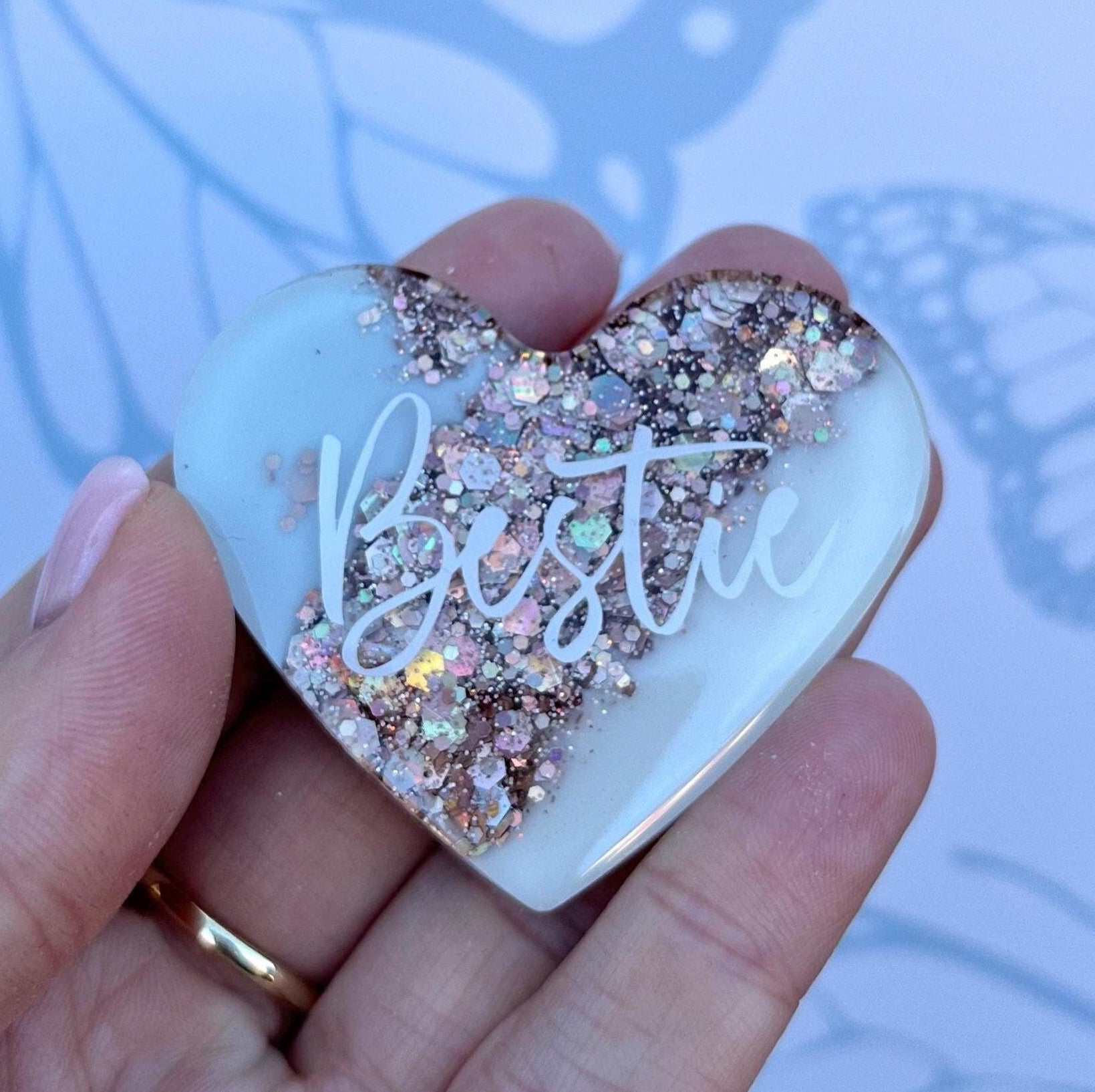 Charming Design: Features a lovely heart shape with a delicate blend of your chosen colour and white hues, accented with choice of glitter. The word 'Bestie' is inscribed in elegant script.