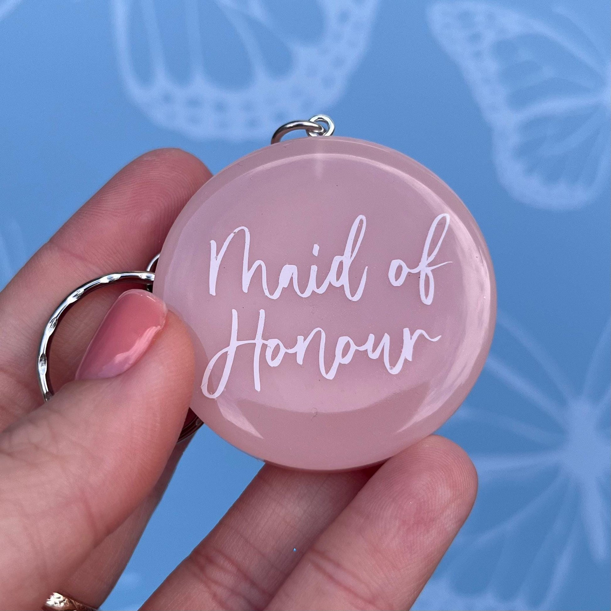 Personalised Options: Choose from a variety of texts to make each keyring uniquely yours. Options include: Bride, Bridesmaid, Maid of Honour, Groom, Flower Girl or choose your own text!