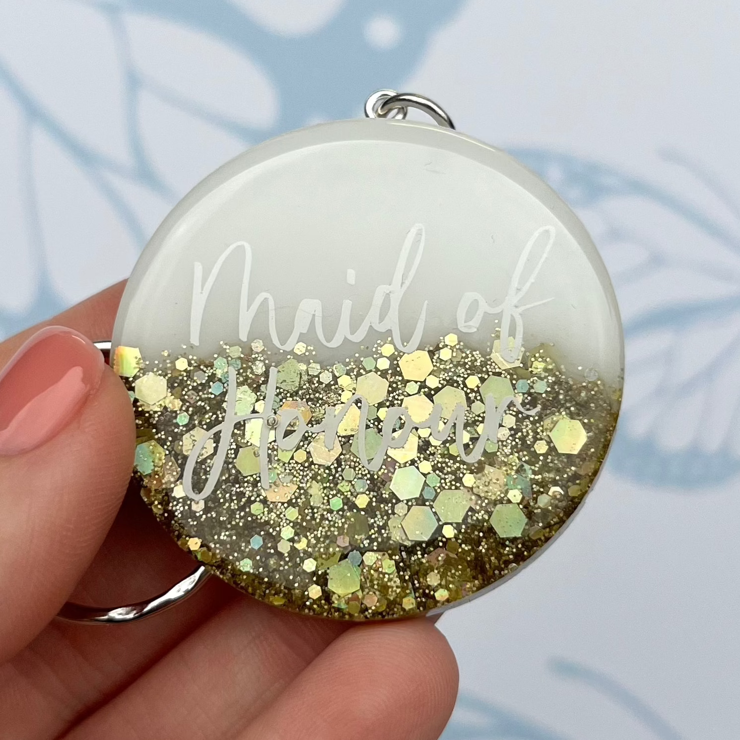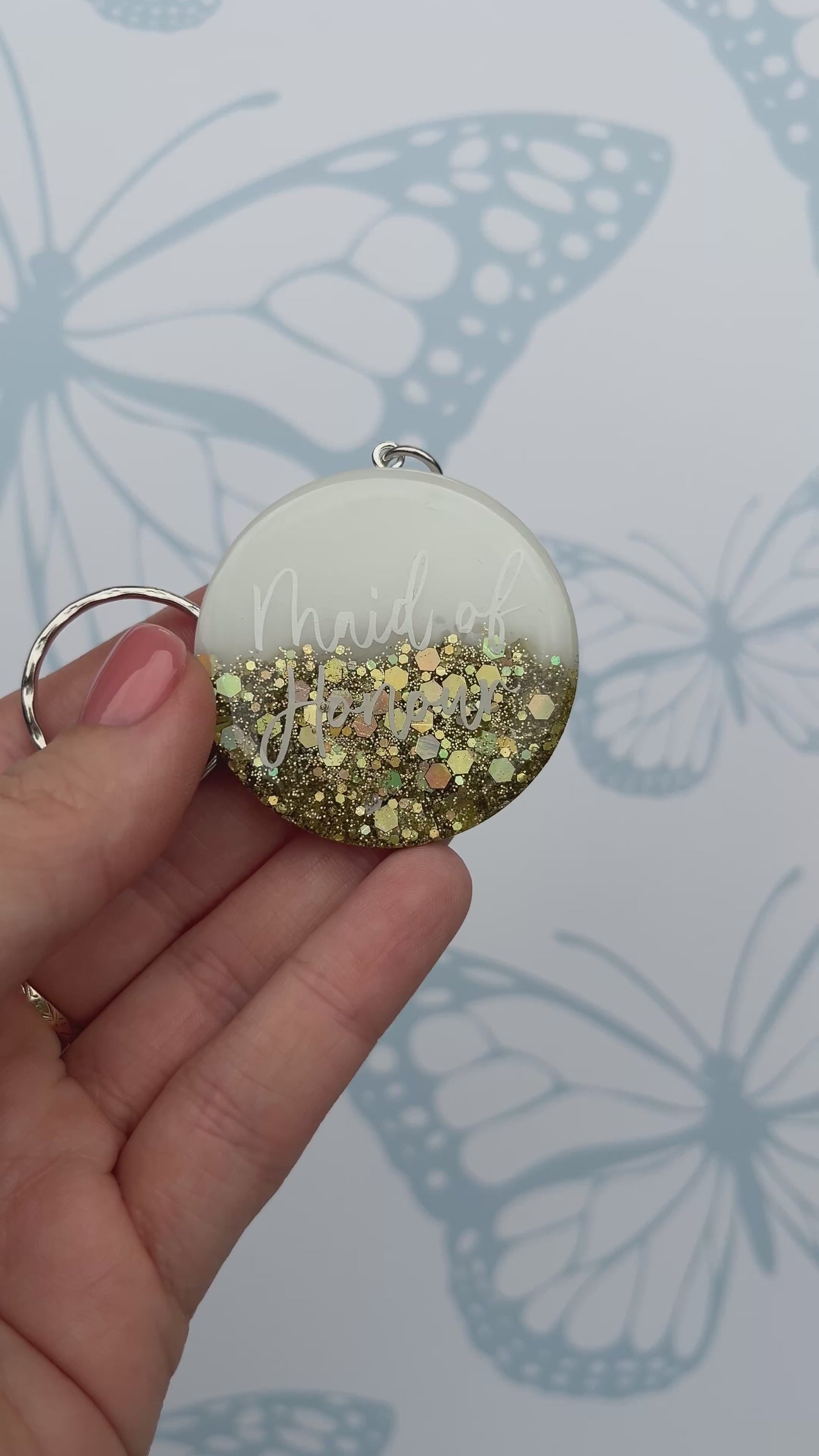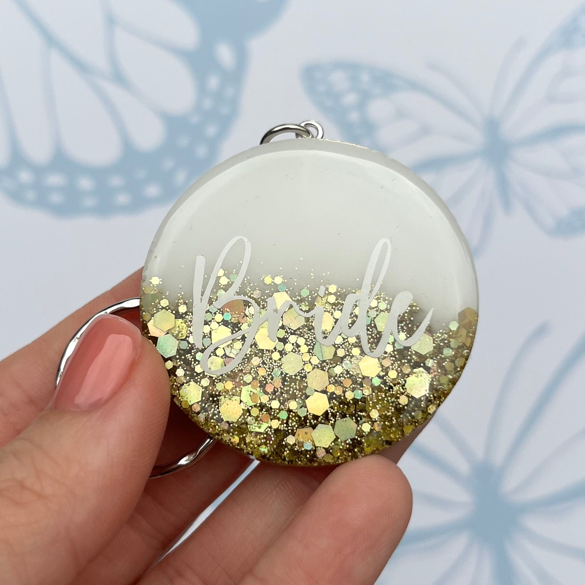 - Personalised Options: Choose from a variety of texts to make each keyring uniquely yours. Options include: Bride, Bridesmaid, Maid of Honour, Groom, Flower Girl or choose your own text!