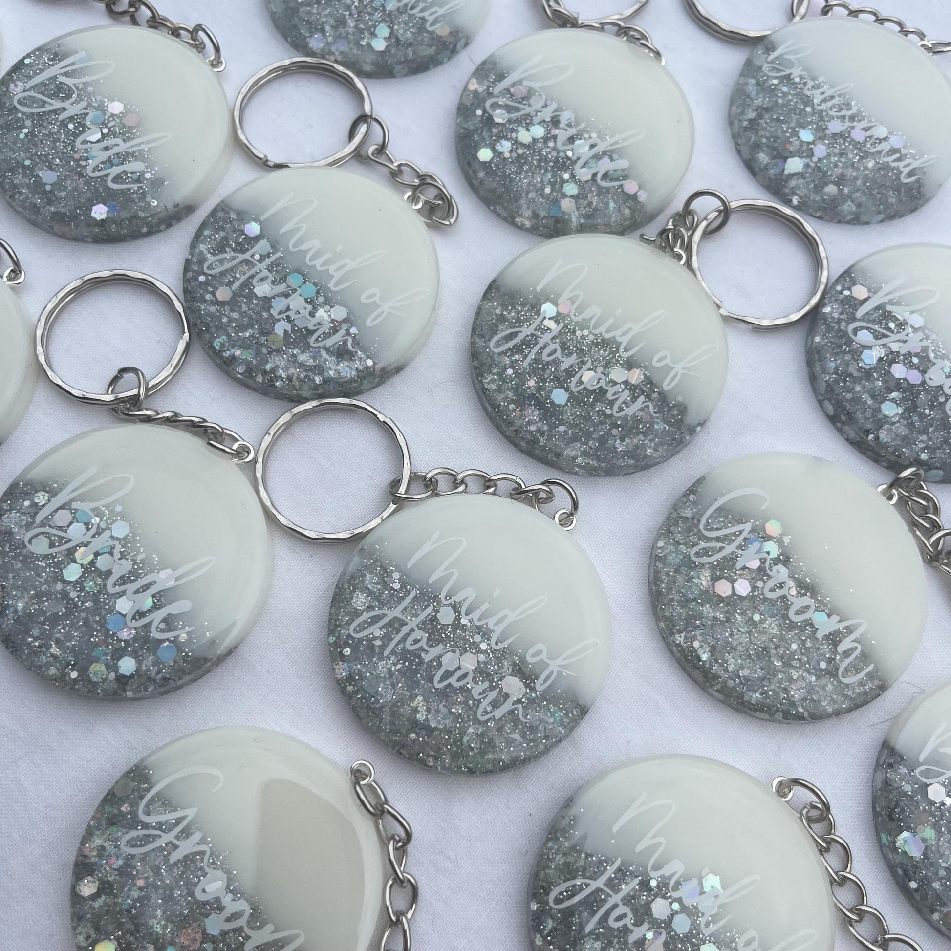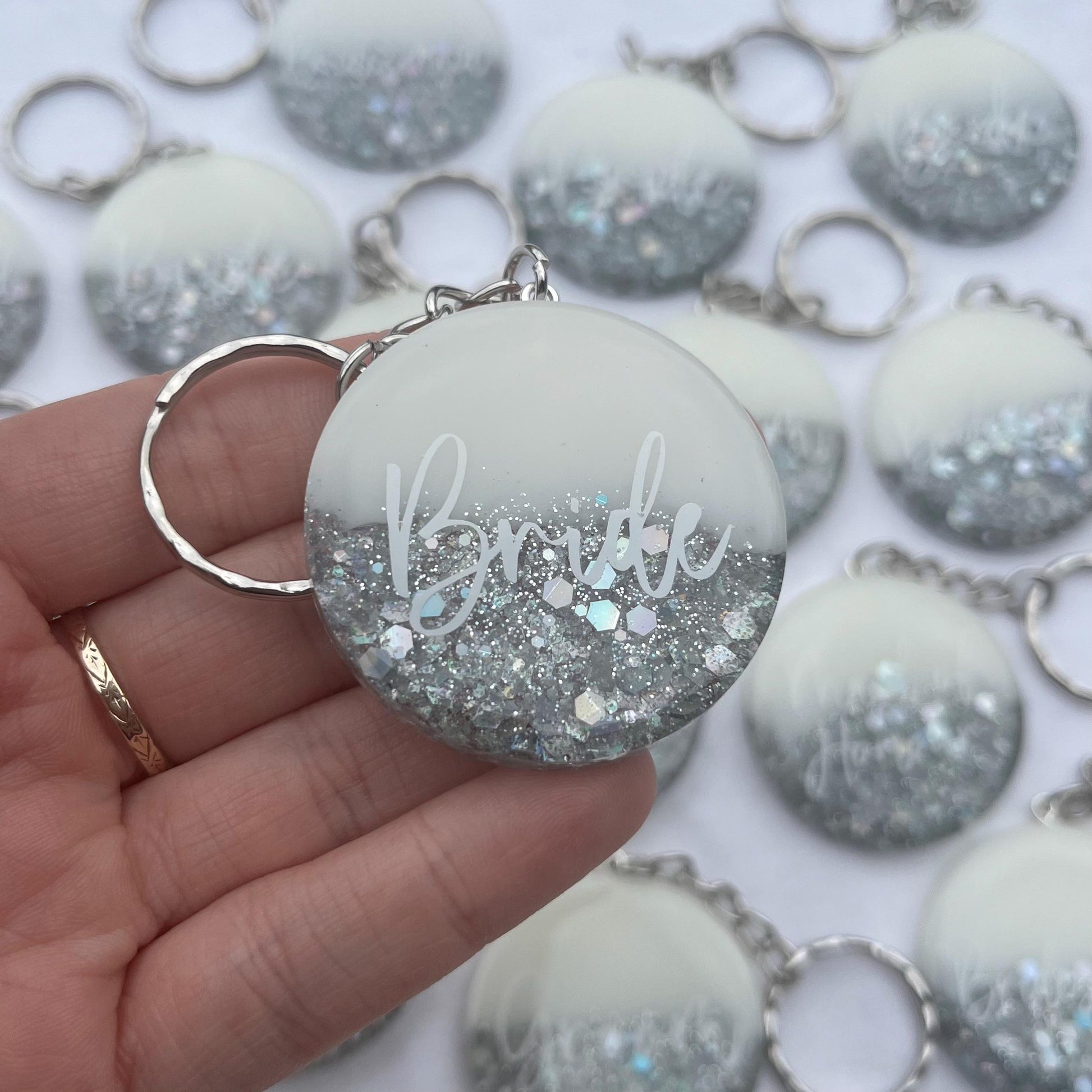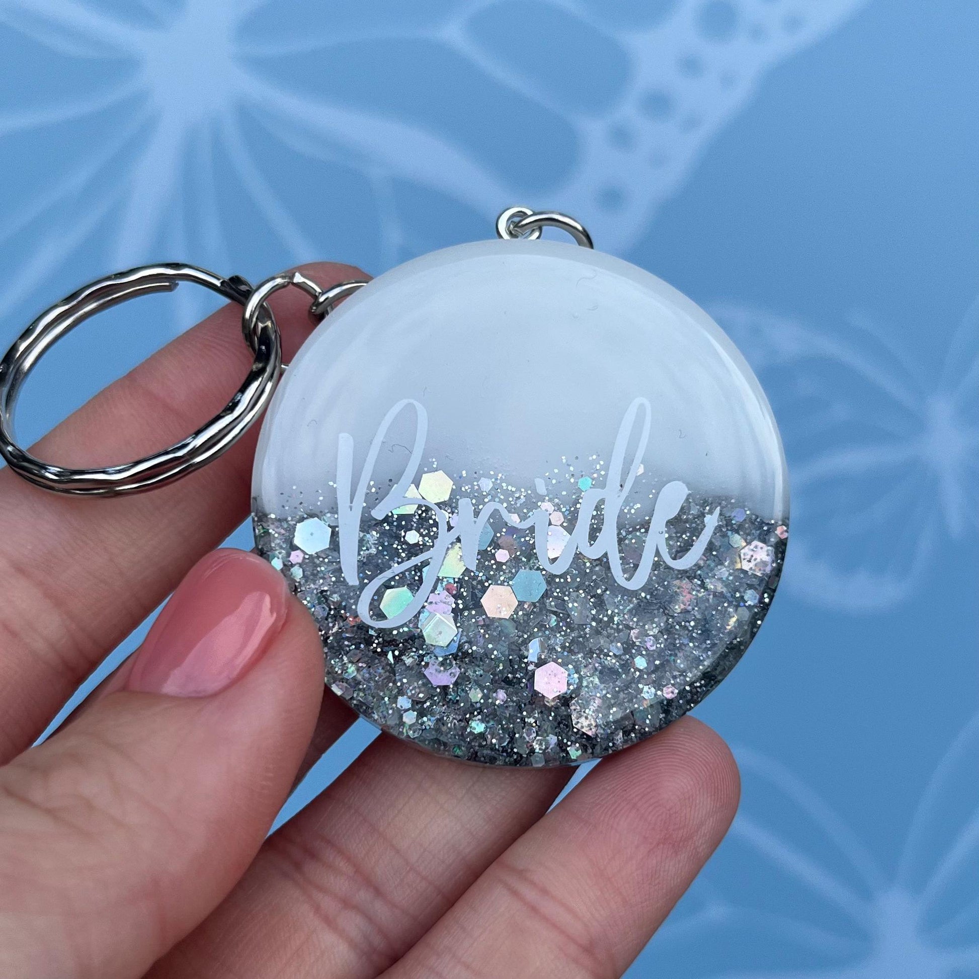 Personalised Options: Choose from a variety of texts to make each keyring uniquely yours. Options include: Bride, Bridesmaid, Maid of Honour, Groom, Flower Girl or choose your own text!