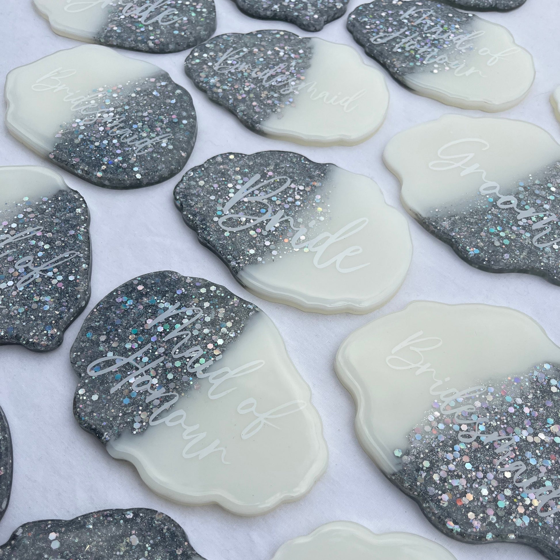 Bridal White & Silver Glitter Coasters Place settings and Favours | Choose your own text or names | Gift for Bride, Maid of Honour, Bridesmaid