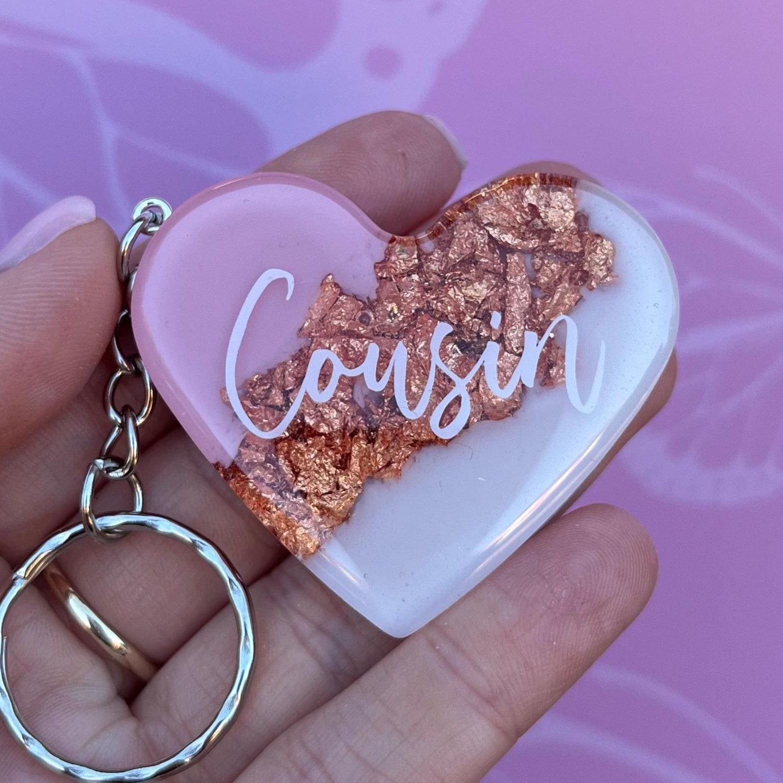 Introducing our Handmade Resin Heart 'Cousin' Keyring, a beautiful and unique gift for your beloved Cousin. Crafted with love and care, this keyring features a stunning blend of pink, blue or lilac with white and a choice of flakes, gold, silver and gold. The elegant script 'Cousin' is delicately inscribed on the heart, making it a perfect personalised gift for any occasion.