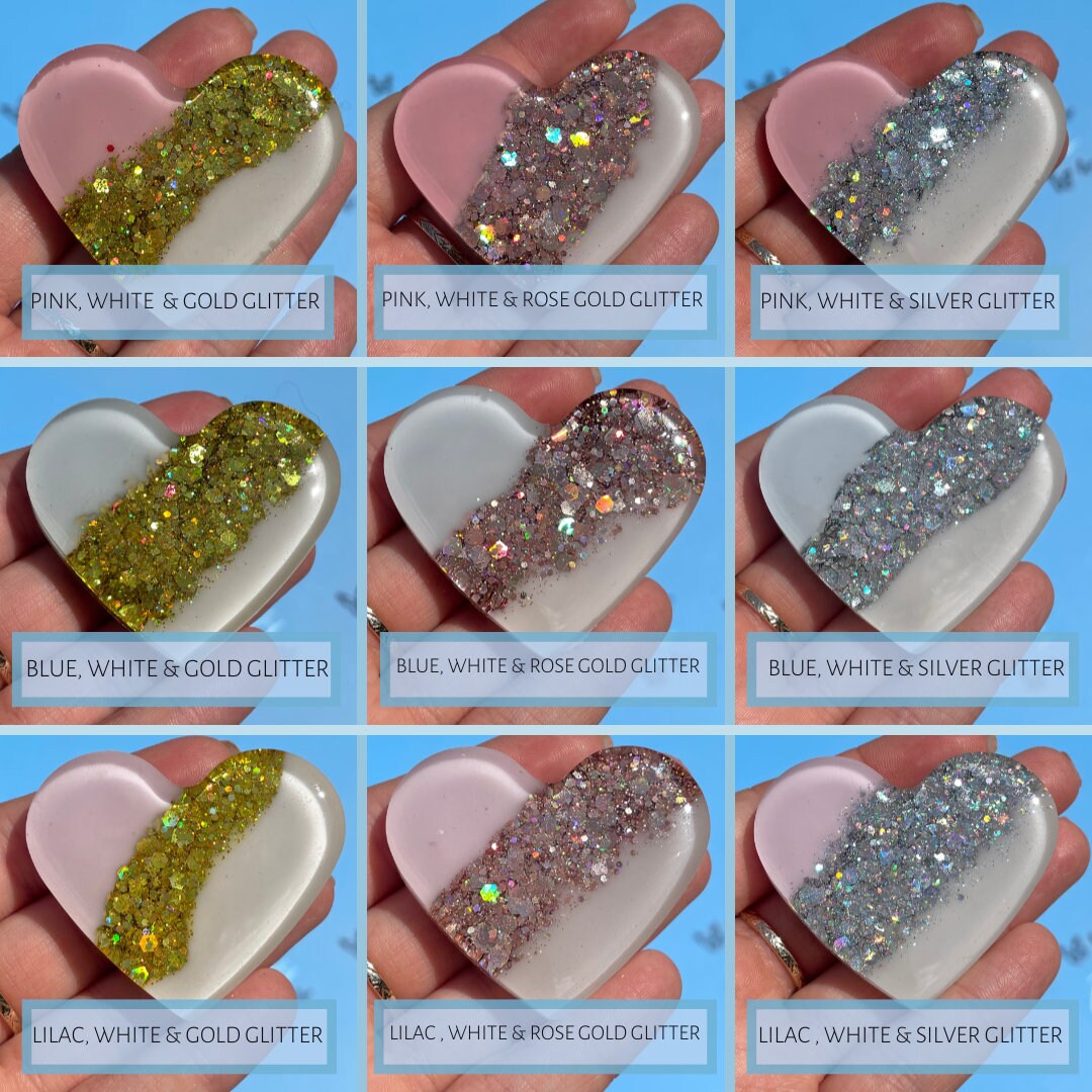 Charming Design: Features a lovely heart shape with a delicate blend of your choice of colour and white hues, accented with choice of glitter. The word 'Nanny' is inscribed in elegant script.