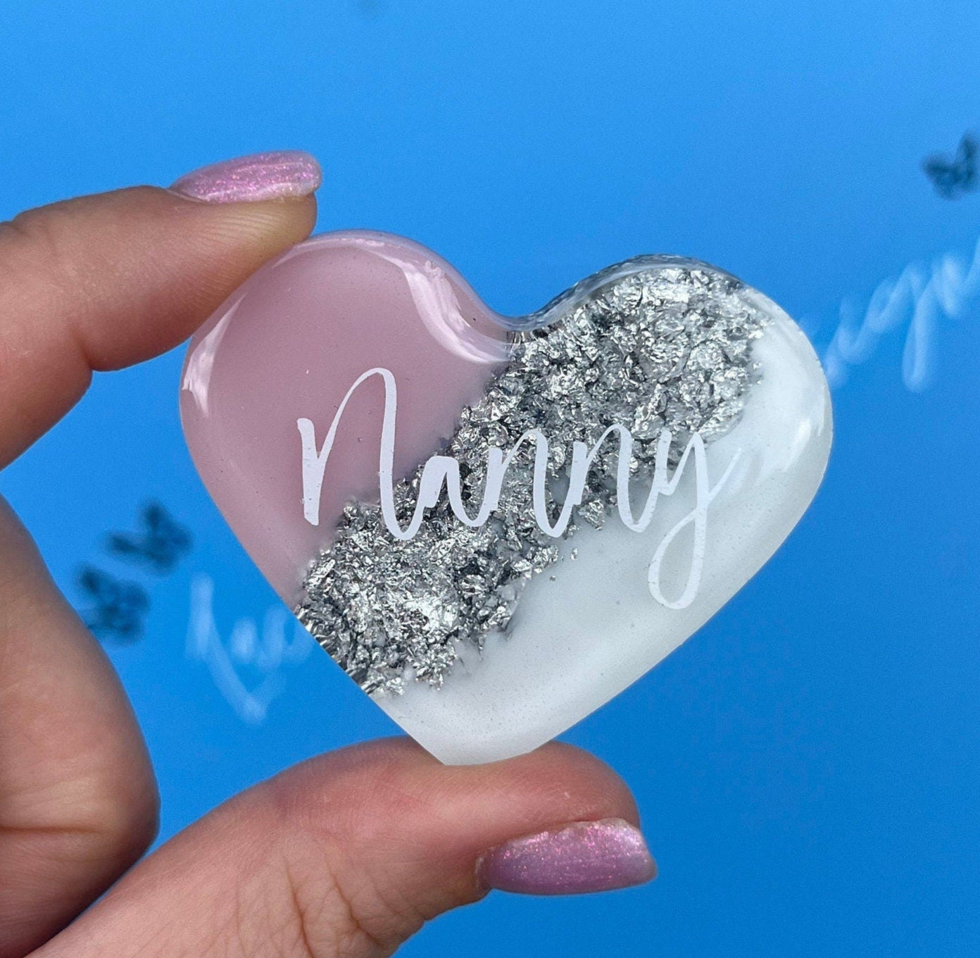 Charming Design: Features a lovely heart shape with a delicate blend of your choice of colour and white hues, accented with choice of flakes. The word 'Nanny' is inscribed in elegant script.