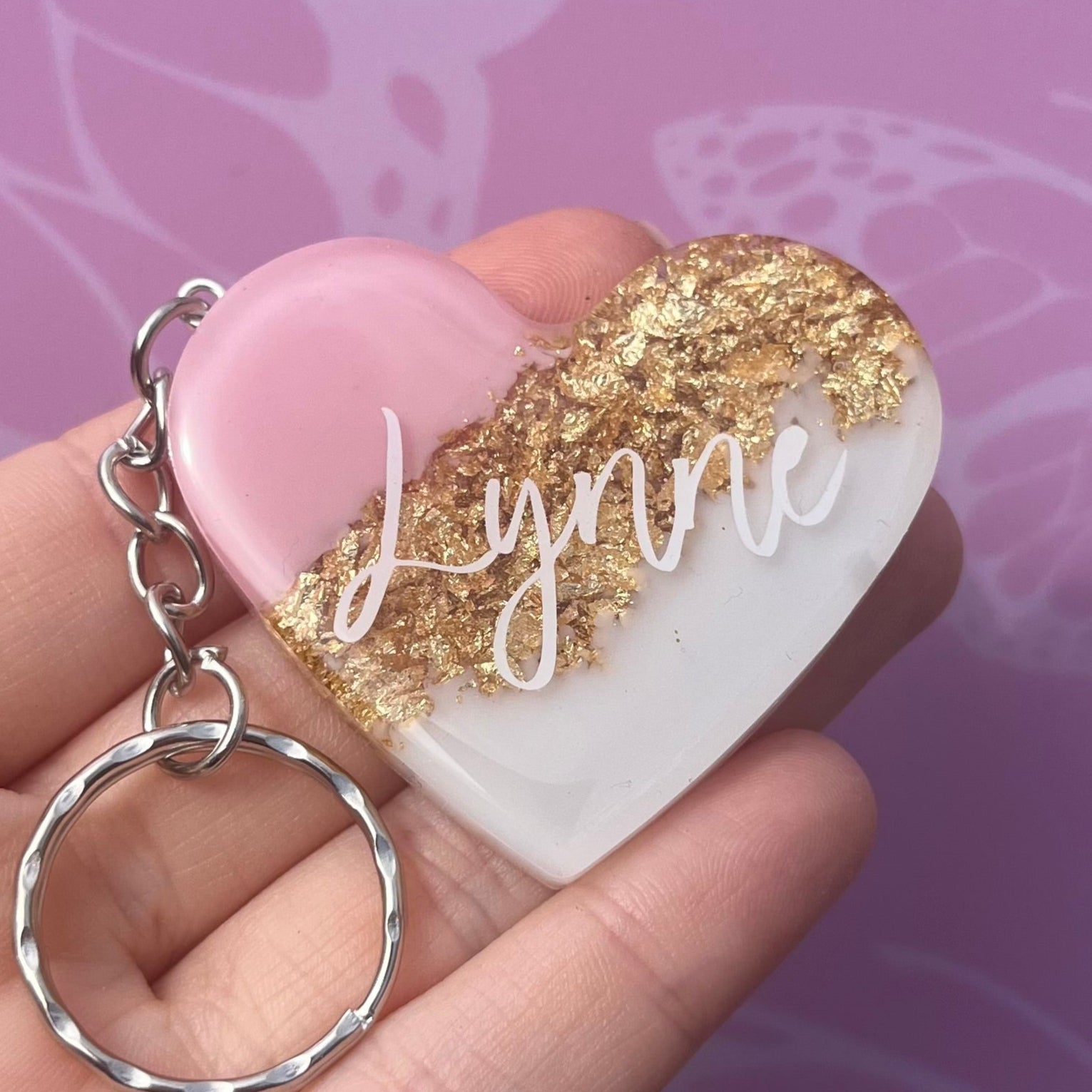 Introducing our Handmade Resin Heart 'Choose any Name/Text' Keyring, a beautiful and unique gift for anyone! Crafted with love and care, this keyring features a stunning blend of pink, blue or lilac with white and a choice of flakes, gold, silver and gold. The elegant script of text or name is delicately inscribed on the heart, making it a perfect personalised gift for any occasion.