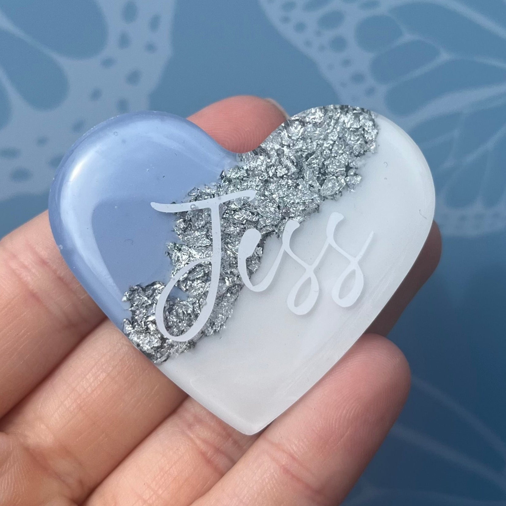 Charming Design: Features a lovely heart shape with a delicate blend of your choice of colour and white hues, accented with choice of flakes. Personalise any Text/Name!