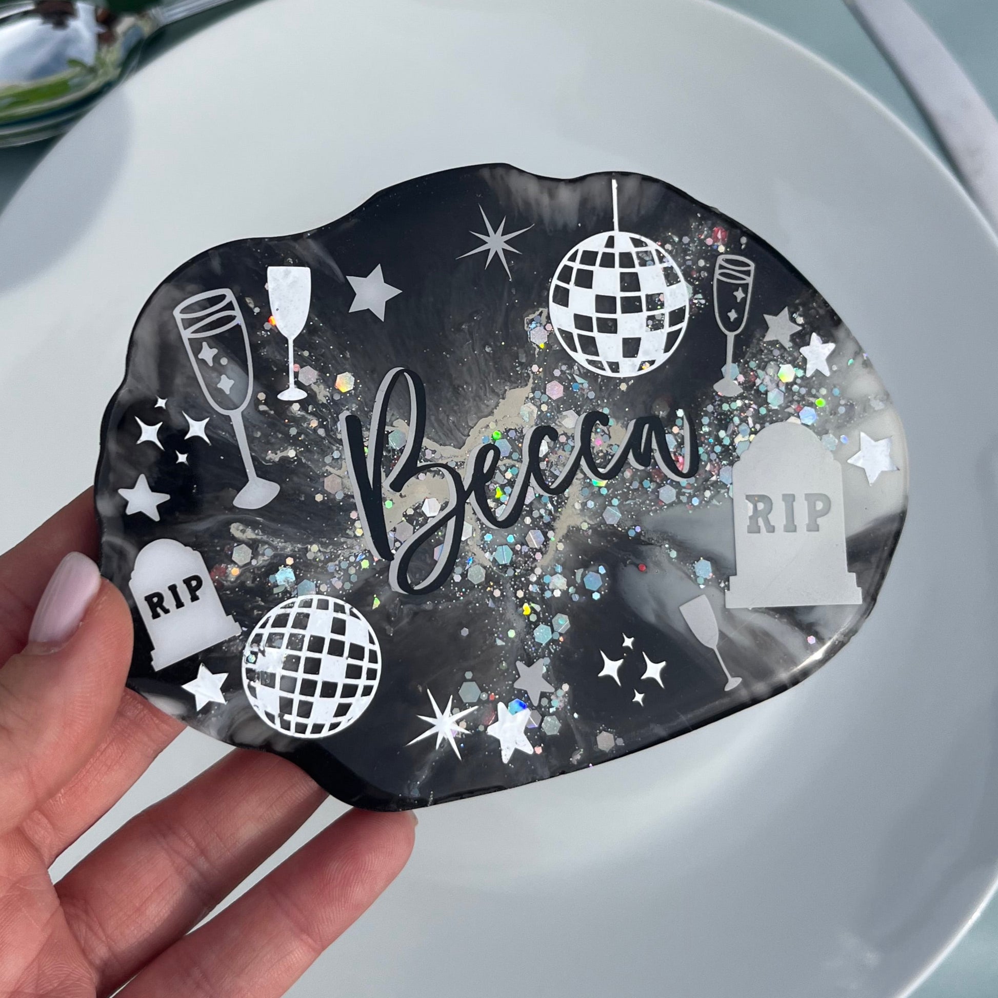 Each coaster comes with a White and silver glitter Marble style, White text and RIP to single life symbols. You can choose the text or name and you can choose the inside colour.